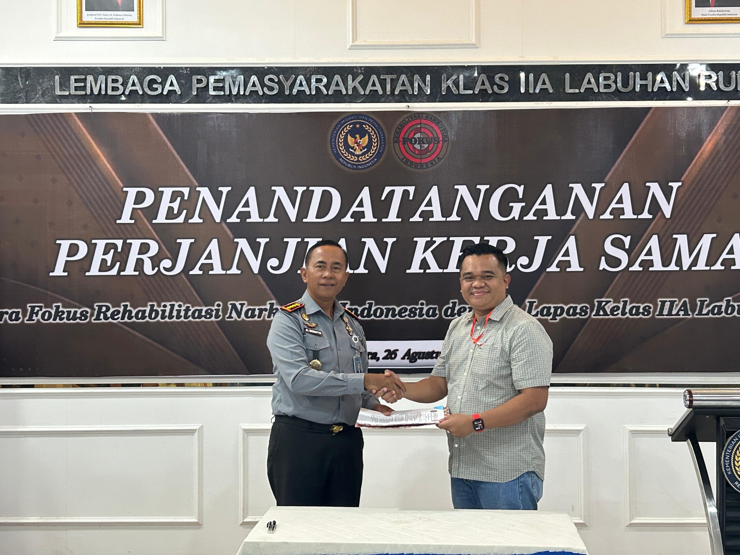 Bertempat di Aula Lapas Labuhan Ruku, digelar kegiatan penandatanganan kerja sama dengan Fokus Rehabilitasi Narkotika Indonesia, Selasa (26/8)