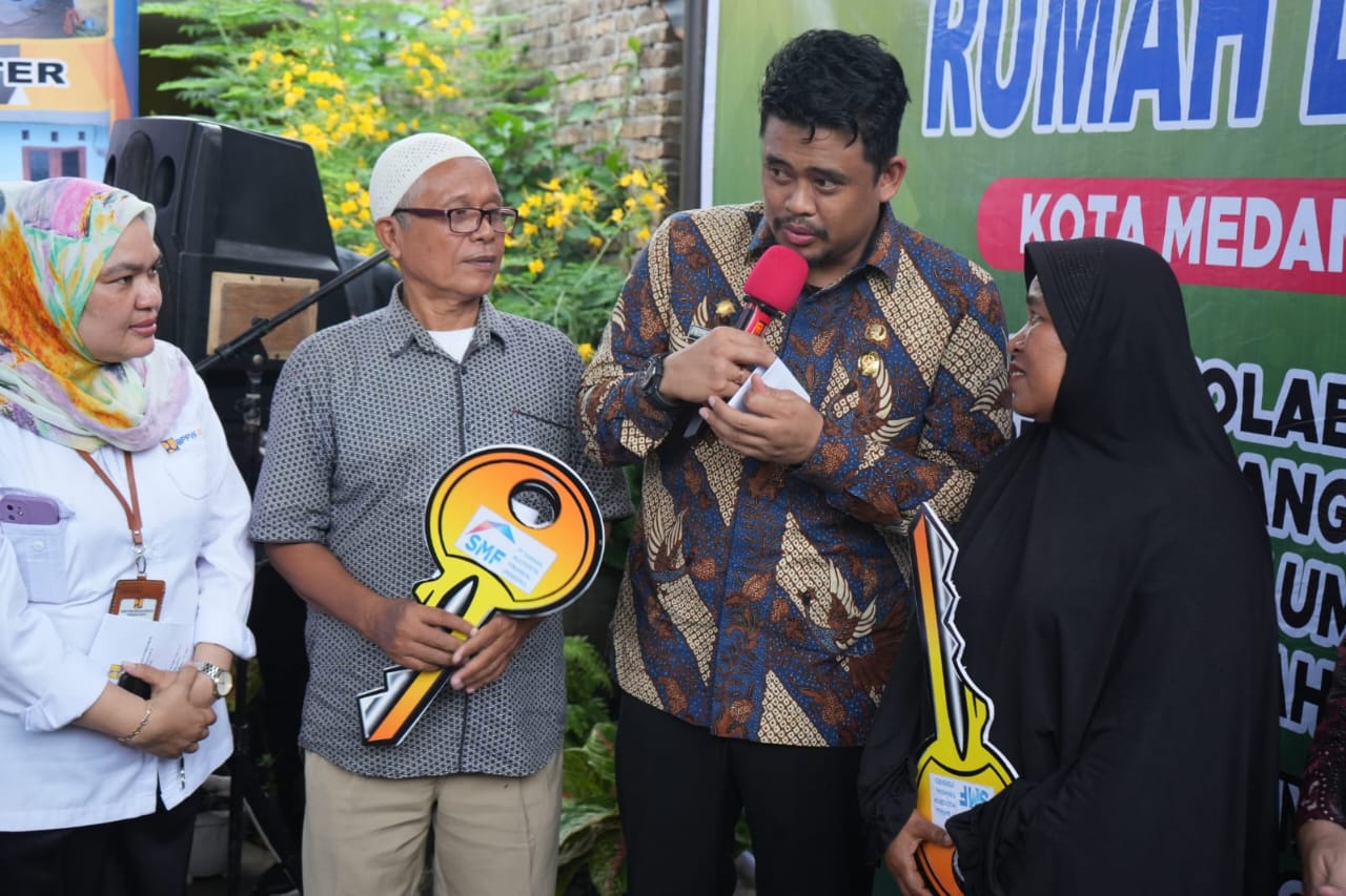 Wali Kota Medan Bobby Nasution menyerahkan kunci rumah secara simbolis kepada dua orang warga rumahnya selesai diperbaiki di Jalan Rawa 1, Kelurahan Tegal Sari Mandala III, Kecamatan Medan Denai, Kamis (09/03/2023).