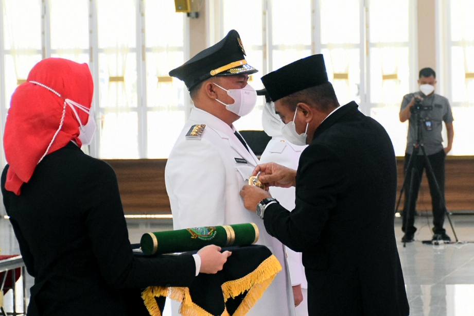 Gubernur Sumatera UtaraEdy Rahmayadi melantik Bupati Labuhanbatu Erik Adtrada Ritonga dan Wakil Bupati Labuhanbatu Ellya Rosa Siregar di Aula Tengku Rizal Nurdin, Rumah Dinas Gubernur, Jalan Jenderal Sudirman Nomor 41 Medan, Senin (13/9/2021). Gubernur minta Bupati dan Wakil Bupati mempercepat serapan anggaran daerah.