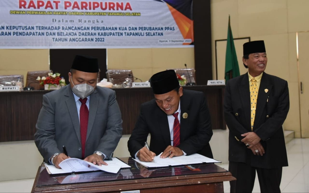 Bupati Tapanuli Selatan (Tapsel) H. Dolly Pasaribu dan Ketua DPRD Tapsel Husin Sogot Simatupang menandatangani nota kesepakatan perubahan Kebijakan Umum Anggaran (KUA) dan Perubahan Prioritas Plafon Anggaran Sementara (PPAS) Tahun Anggaran 2022 pada Rapat Paripurna ,Senin (5/9/2022).