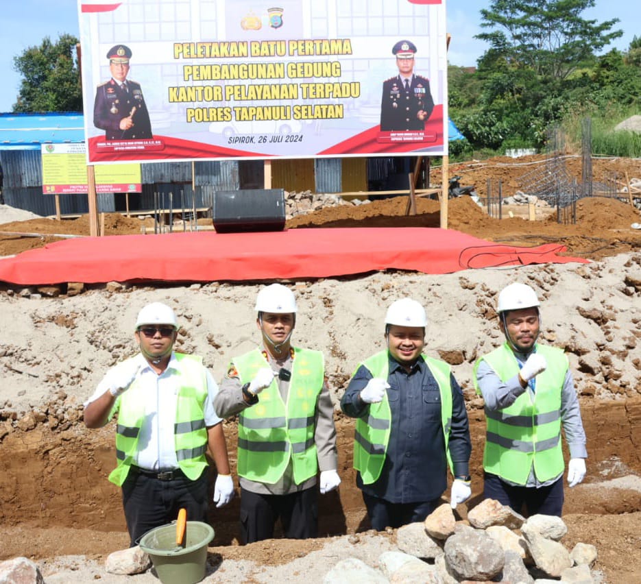 Bupati Tapanuli Selatan (Tapsel) Dolly Pasaribu menghadiri peletakan batu pertama pembangunan gedung Kantor Pelayanan Terpadu Polres Tapsel, Jumat (26/07/2024).