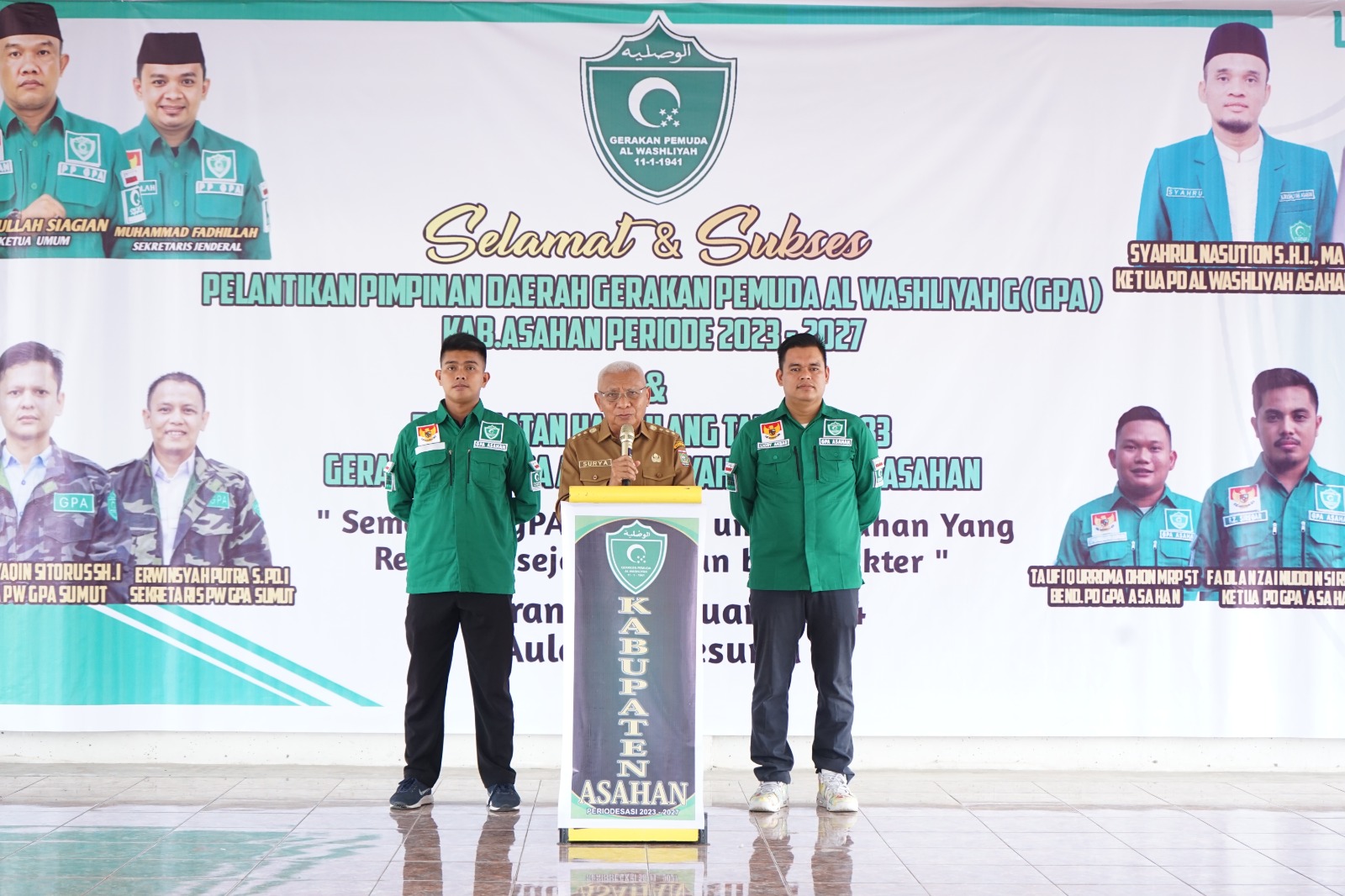 Bupati Asahan H. Surya, menghadiri pelantikan Pimpinan Daerah Gerakan Pemuda Al Washliyah (PD GPA) Kabupaten Asahan Periode 2023-2027 di Joglo DPD Pujakesuma Kabupaten Asahan, Selasa (30/01/2023).