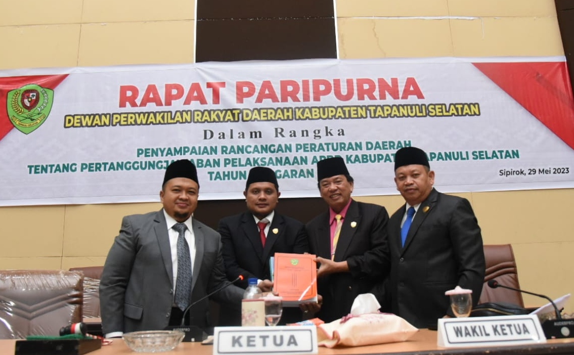 Bupati Tapanuli Selatan (Tapsel) H. Dolly Pasaribu menyampaikan Rancangan Peraturan Daerah (Ranperda) Pertanggungjawaban Pelaksanaan APBD Kabupaten Tapsel Tahun Anggaran (TA) 2022 pada rapat paripurna DPRD di Gedung DPRD Tapsel Jalan Prof Lafran Pane, Sipirok, Senin (29/05/2023).
