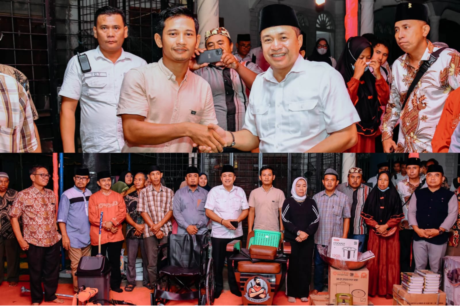Setelah rangkaian kegiatan zikir, doa, serta makan bersama usai, Bupati dan rombongan menyerahkan berbagai bantuan kepada masyarakat antara lain bantuan pengeras suara untuk musholla, Al-Qur’an, dukungan untuk pelaku UMKM, kursi roda, bibit ikan dan tanaman serta bantuan beras dan santunan bagi kaum dhuafa.