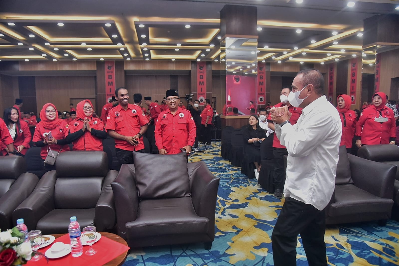 Gubernur Sumatera Utara Edy Rahmayadi menghadiri pelantikan Banteng Muda Indonesia (BMI) Sumut.Edy mengajak seluruh pihak bersatu membangun daerah menjadi Sumut Bermartabat.
