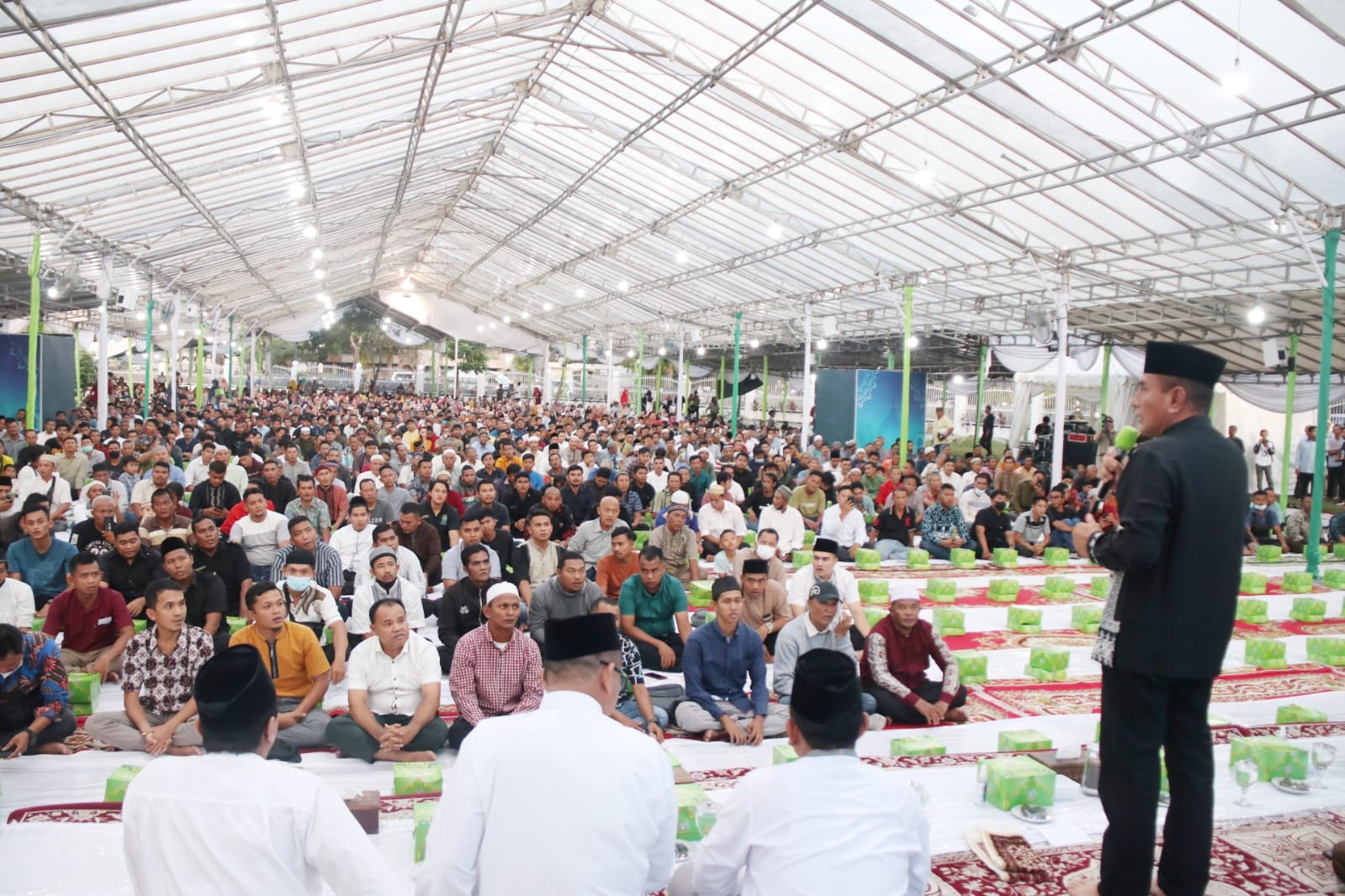 Petugas Kebersihan di lingkungan Pemprov Sumut buka puasa bersama dengan Gubernur Sumut Edy Rahmayadi di halaman masjid Rimah Dinas Gubernur Jl.Sudirman 41 Medan,Minggu (09/04/2023).