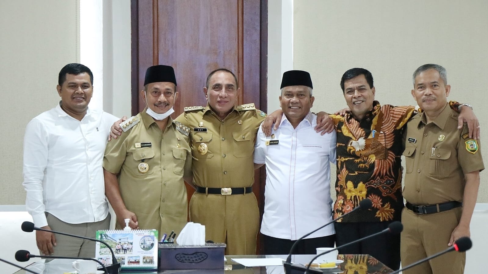 RANGKULAN – Gubernur Sumut Edy Rahmayadi merangkul Bupati Palas TSO, Plt Bupati /Wakil Bupati Ahmad Zarnawi Pasaribu didampingi Ketua DPRD Palas Amran Pikal Siregar, Wakil Ketua I DPRD Palas Sahrun Hasibuan,Sekda Palas Arpan Nasution di Kantor Gubernur.(Foto : Istimewa)