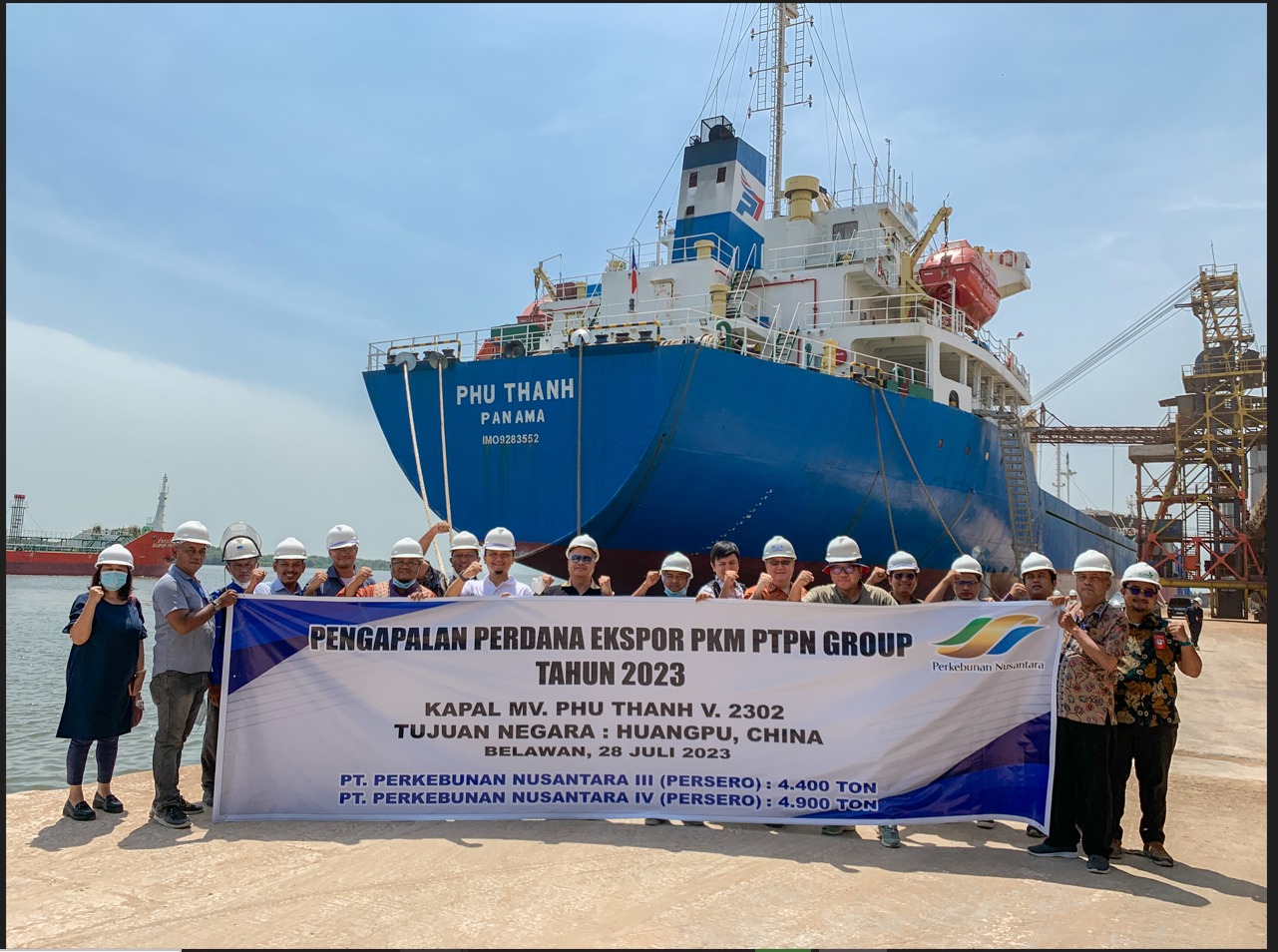 Holding Perkebunan Nusantara PTPN III (Persero) ekspor perdana palm kernel meal dengan tujuan Huangpu China, senilai Rp18,2 Miliar (1,2 Juta USD) di Pelabuhan Belawan Medan Sumatera Utara, Jumat (28/07/2023).