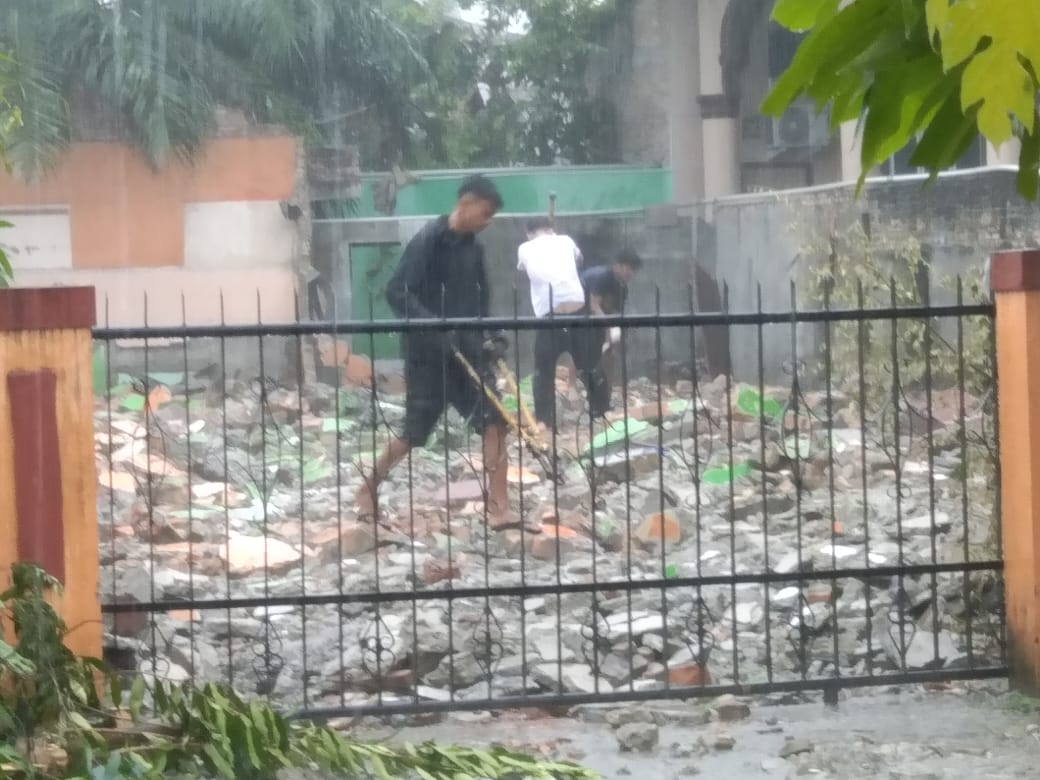 Ramadhan Ke-27 1444 H, tiga anak muda kelihatan rela berpanas dan berhujan dengan gigih menggodam coran semen pada besi beton di reruntuhan rumah gedung yang dibuldozer pada Selasa pagi (18/04/2023).