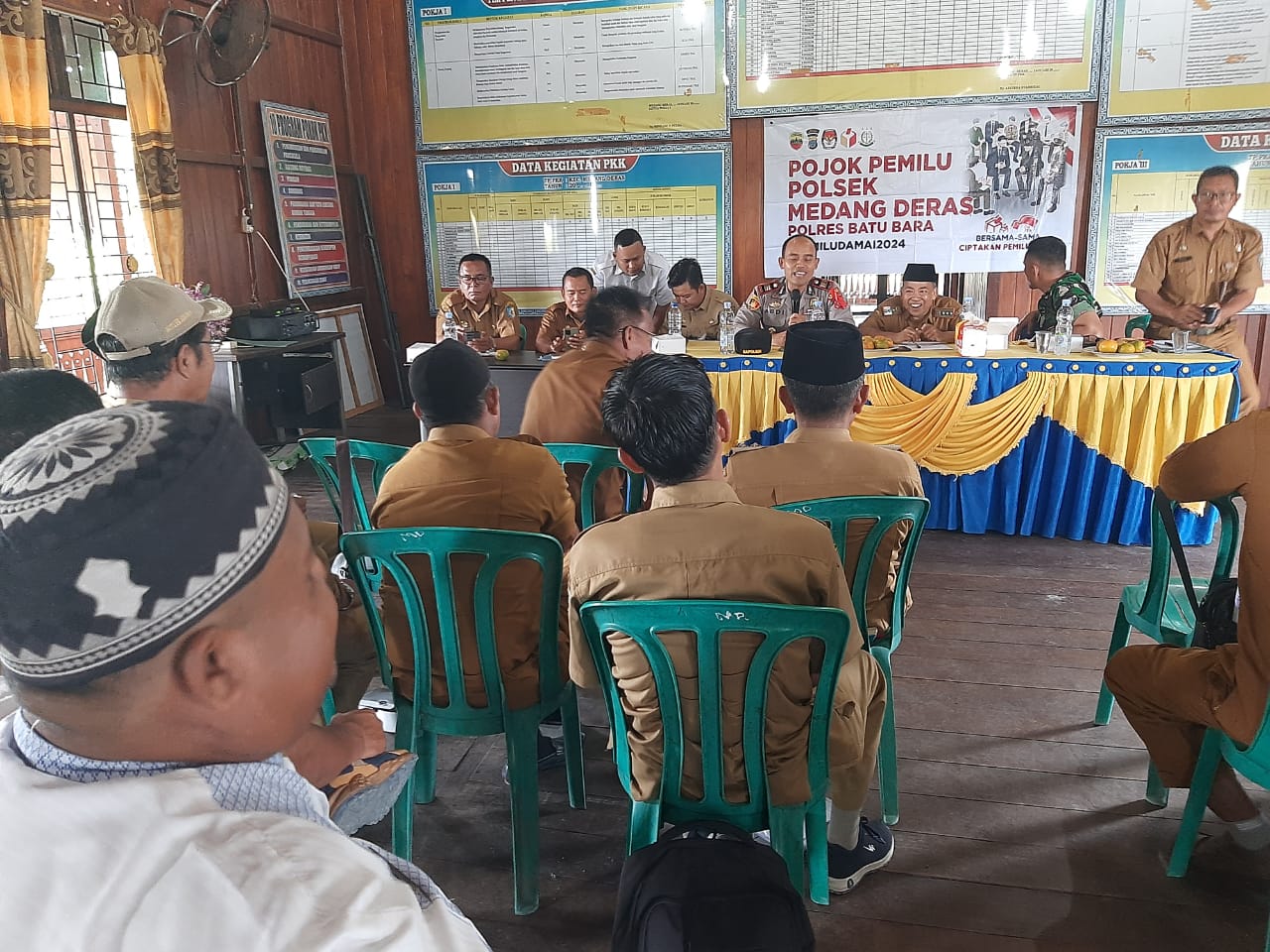 Dalam kegiatan Pojok Pemilu dilaksanakan secara santai dan penuh kekeluargaan, Kapolsek bersama personil melakukan pertemuan dengan masyarakat berlangsung di Aula Kantor Camat Medang Deras,Selasa (23/1/2020).
