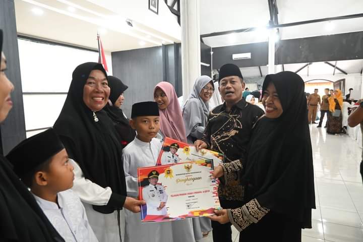 Penyerahan beasiswa dengan total anggaran Rp.200 juta kepada 200 – mahasiswa dan mahasiswi berprestasi keluarga kurang mampu diserahkan Wali Kota Waris Tholib didampingi Kabag Kesra Darujiah Astuti Sinaga.