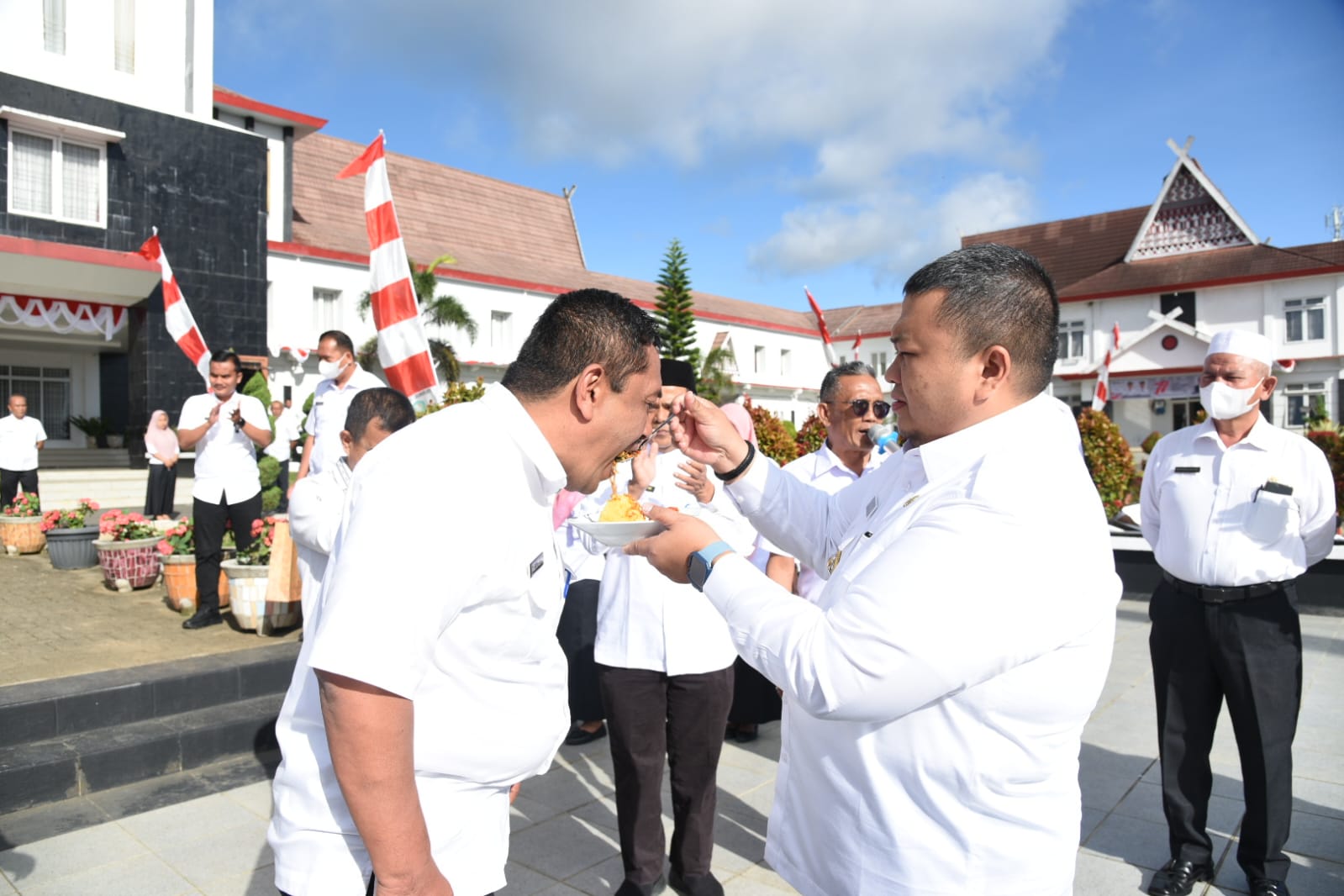 Pemotongan nasi tumpeng dilakukan setelah Apel Gabungan di Lapangan Parade Perkantoran Pemkab Tapsel, Rabu (31/8/2022).