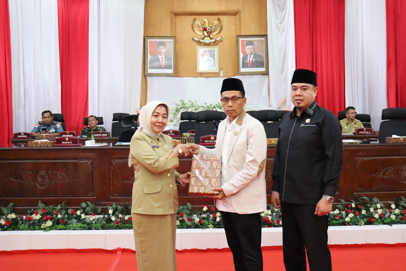 Sekda Norma Deli Seregar menyerahkan LKPJ T.A.2023 kepada Ketua DPRD Batu Bara M.Safi’i (Foto : Istimewa)
