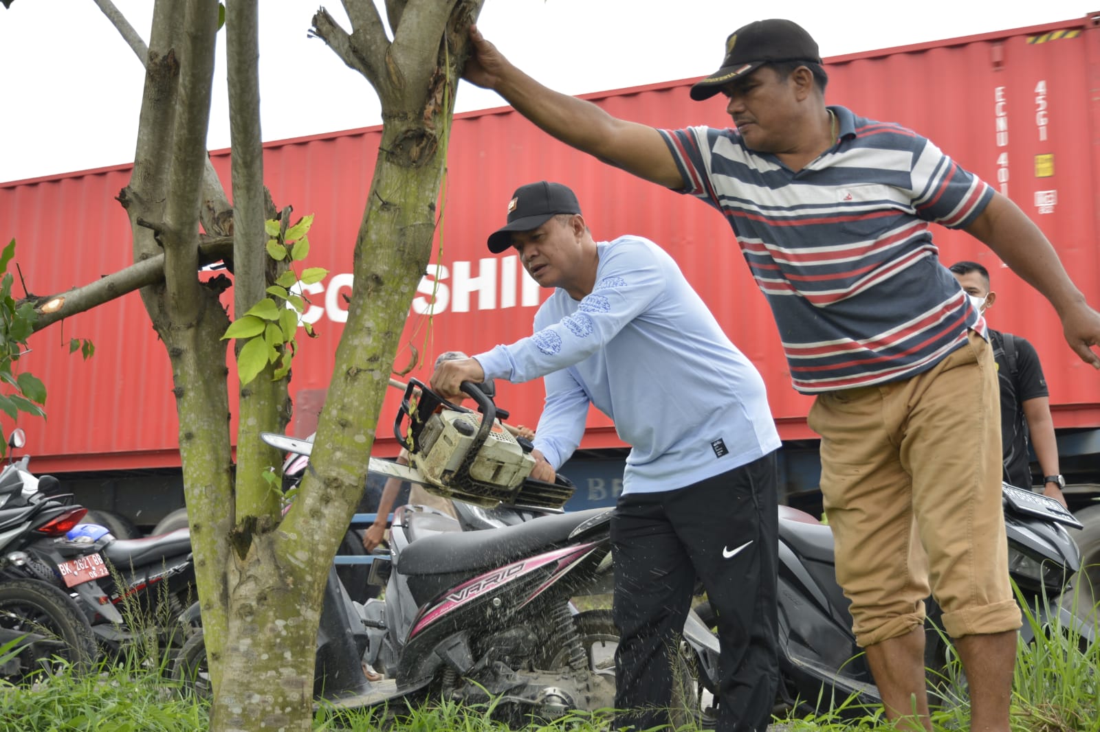 Puluhan personil Polsek Indrapura dipimpin Wakapolsek Indrapura IPTU Arianto Sitorus berbaur dengan Bupati Batu Bara Ir.H.Zahir,M.AP, Instansi,Camat Air Putih Rahmad Khàidir Lubis, kepala desa, perangkat desa bergotong royong memperbaiki saluran irigasi Dusun VIII Desa Tanah Tinggi Kecamatan Air Putih Kabupaten Batubara,Kamis (20/10/2022)