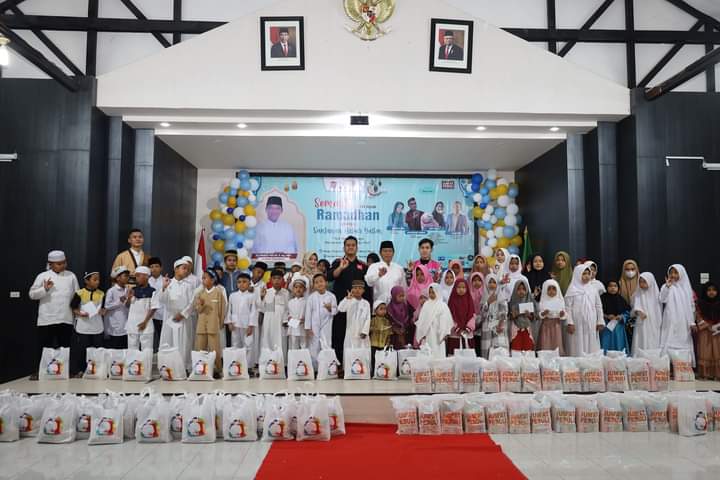 Ramadhan Ke-25 , Wali Kota Waris Serahkan Bingikisan Lebaran Kepada 300 Anak Yatim. Tanjungbalai I membara news.com. Ramadhan ke-25 1444 H , Wali Kota H Waris Tholib kembali berbagi kebahagian bersama anak yatim dalam acara Ramadhan Fest " Sehari Bersama Yatim " diselenggarakan The Yatim Village Tanjungbalai. Raut wajah bahagia Waris terpancar saat menyerahkan bingkisan lebaran kepada 300 anak yatim di Pendopo Rumah Dinas Wali Kota , Minggu pagi (16/4/2023). Waris berharap kegiatan berbagi bersama anak yatim terus berlanjut setiap tahunnya. Karena kebahagiaan anak yatim adalah tangung jawab bersama. Adapun tema penyelenggaraan Yatim Fest tahun ini yaitu " Menjemput Pertolongan Allah dengan Doa 300 anak yatim. Pada acara tampak hadir yakni Ketua PKK Tan jungbalai Hj Fatiah Haitami ,Kabag Kesra Darujiah Astuti Sinaga dan Kabag Umum Hurma ini Nasution. Kemudian Minggu sore (16/4/2023) di Pendopo Rumah Dinas Wali Kota , Waris kembali merasa bahagia dapat berkumpul bersama berbagi rasa dengan anak yatim yang dilaksanakan oleh Jumat Peduli Tanjungbalai (JPT ). " Alhamdulillah bersyukur kita Kepada Allah SWT karena dapat berkumpul dan berbagi di bulan berkah ini bersama anak yatim Insya Allah kegiatan ini dapat menjadi ladang amal bagi manusia " ucap Waris dalam sambutannya Pada momen tersebut Waris membagikan paket sembako kepada 50 anak yatim. Sedang bingkisan lainnya diberikan oleh Jumat Peduli Tanjungbalai ( JPT ). Selain menggelar kegiatan santunan Semarak Ramadhan 1444 H , JPT juga diisi dengan rang kalian acara hiburan Sulap oleh Muhammad Hendri. Nida KDI ( Khoirun Nisa ) yang melantunkan lagu- lagu Salawat dan Pop Religi Islami serta mendatangkan Pendongeng Nur Fadilla. ( Rsp ).