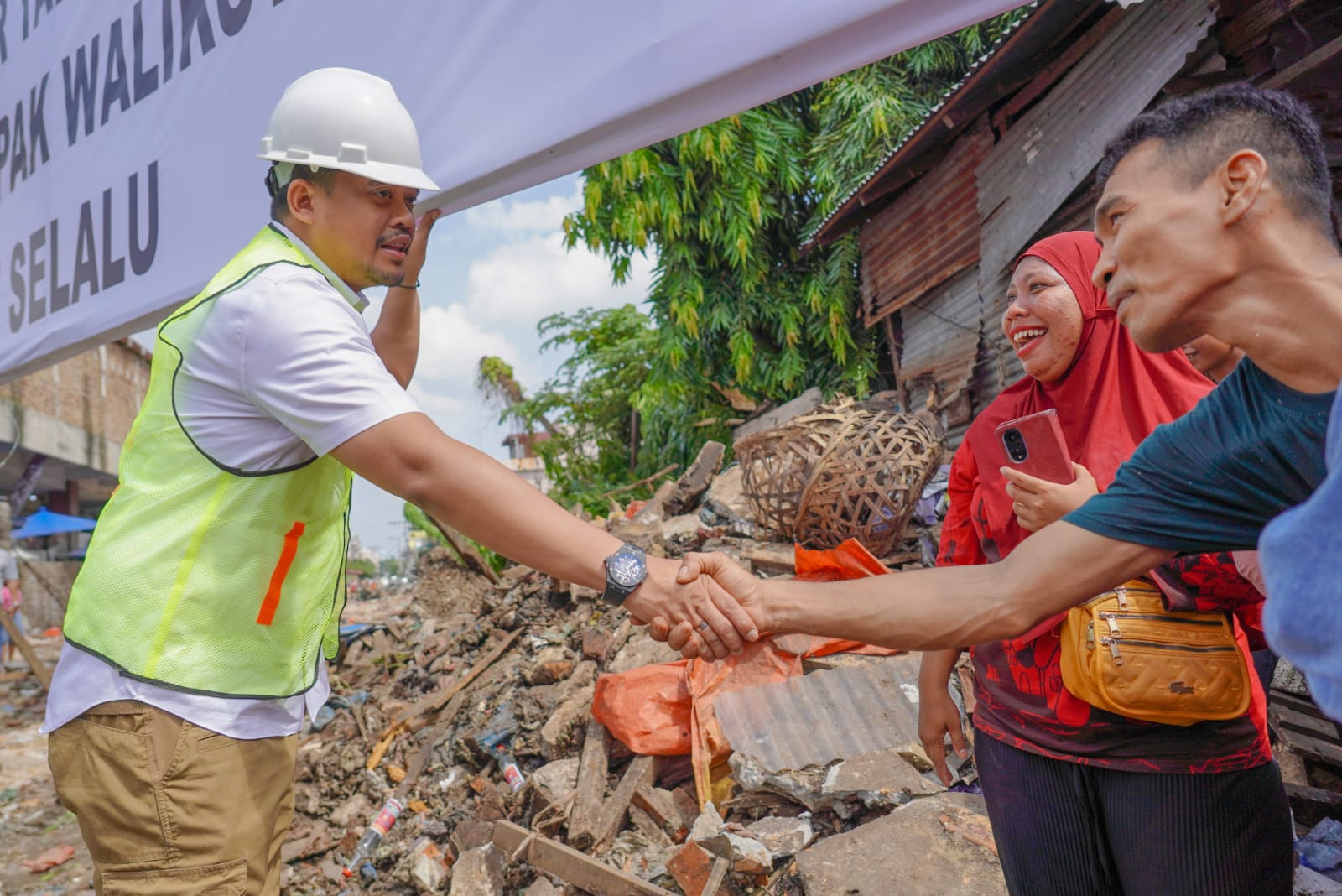 Wali Kota Medan Bobby Nasution menyalami pedagang usai peletakan batu pertama Pasar Akik Medan.(Foto : Kominfomdn)