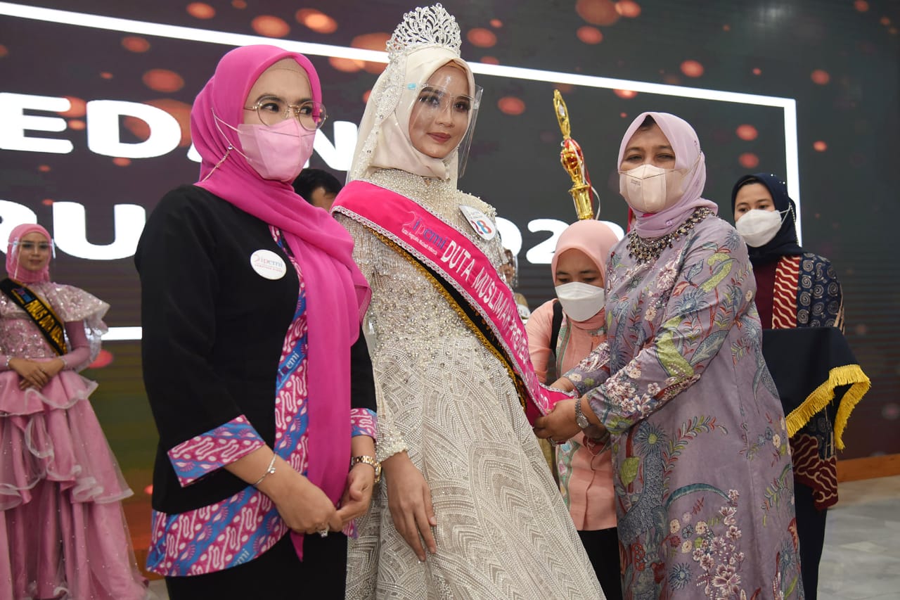 Ketua TP PKK Sumut Nawal Lubis memasang selempang Duta Muslimah Preneur 2022,Jumat (11/2/2022)