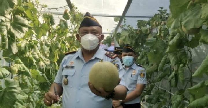 Kepala Rutan 1 Medan Theo Adrianus menyaksikan panen tanaman hidroponik buah melon yang dikelola sub seksi bimbingan kegiatan kerja Rutan 1 Medan.Panen melon membutuhkan waktu sekitar 3 bulan bebas pestisida dan berkualitas sangat baik.