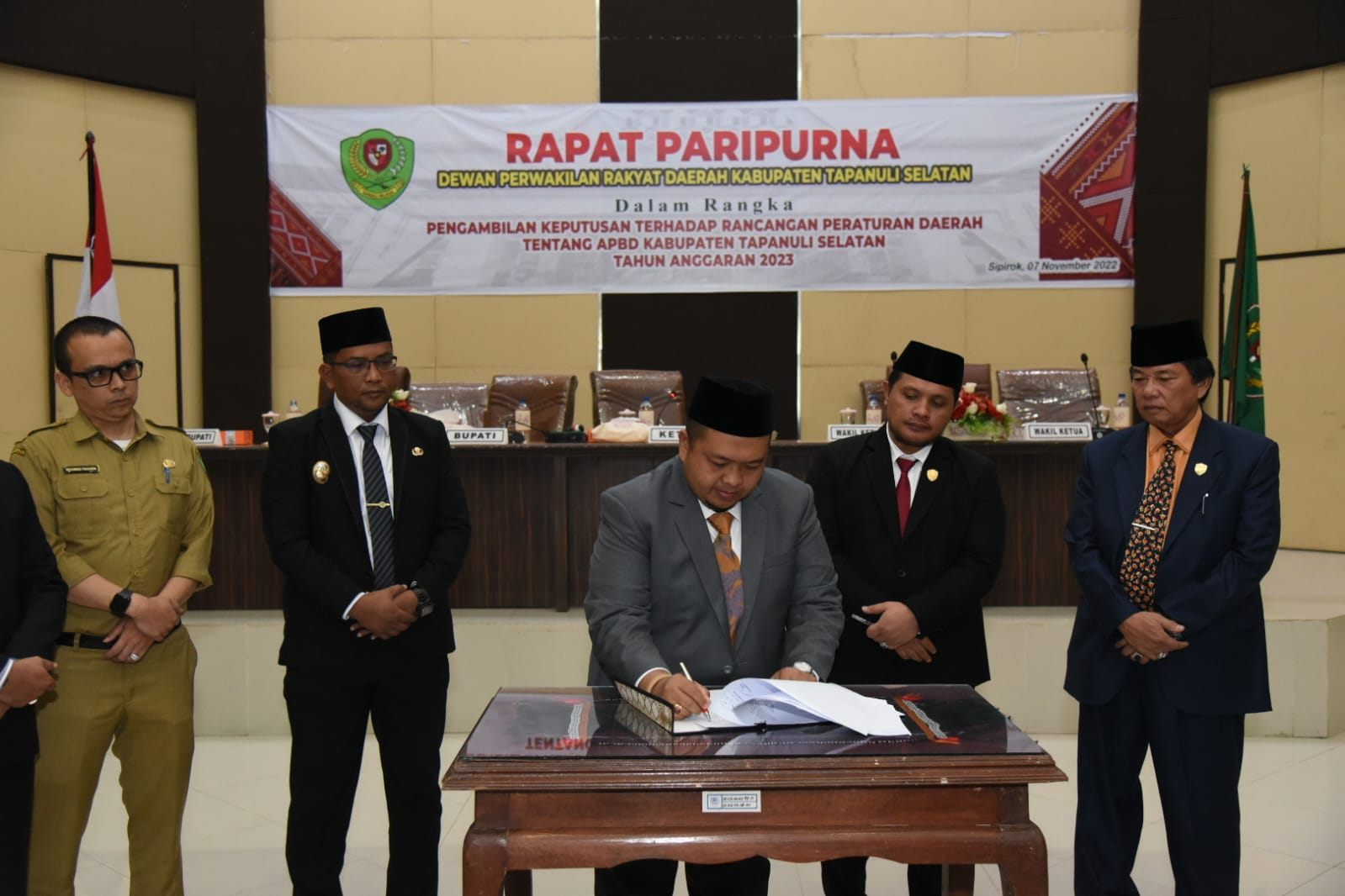 Bupati Tapanuli Selatan (Tapsel) H. Dolly Pasaribu bersama DPRD menyetujui Ranperda APBD Kabupaten Tapsel Tahun Anggaran (TA) 2023 menjadi Peraturan Daerah (Perda).