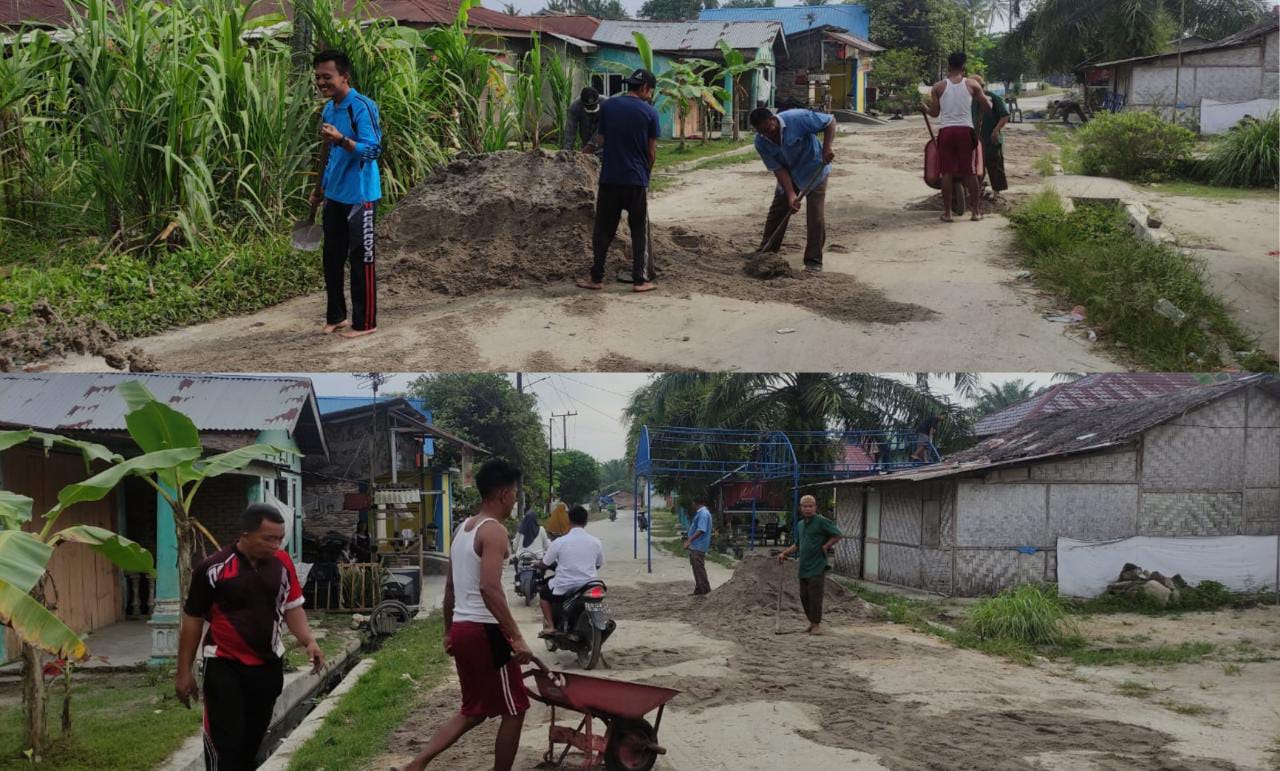 Gotong royong dihadiri LPM, Karang taruna, PKK Desa dan Perangkat Desa membersihkan bahu jalan dan lening permukiman Desa