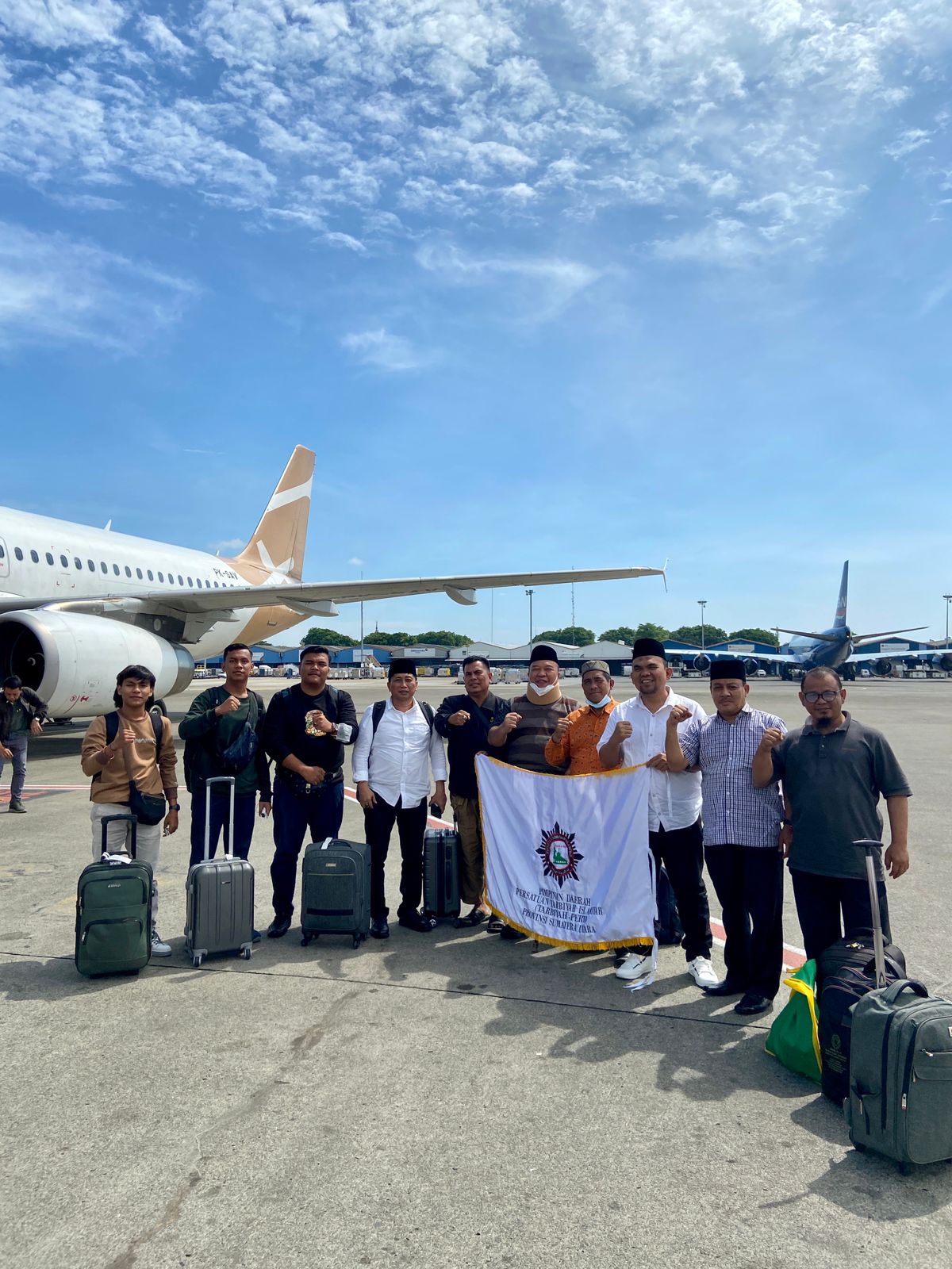 Delegasi Tarbiyah-Perti Sumut bersama Ormas Serumpun Perwati,IPTI,PII,HIMTI,OSTI,PC Tarbiyah-Perti Kabupaten/Kota berangkat ke Muktamar Bersama di Jakarta melalui Bandara Kualanamu Deli Sedang,Minggu pagi (22/10/2022).