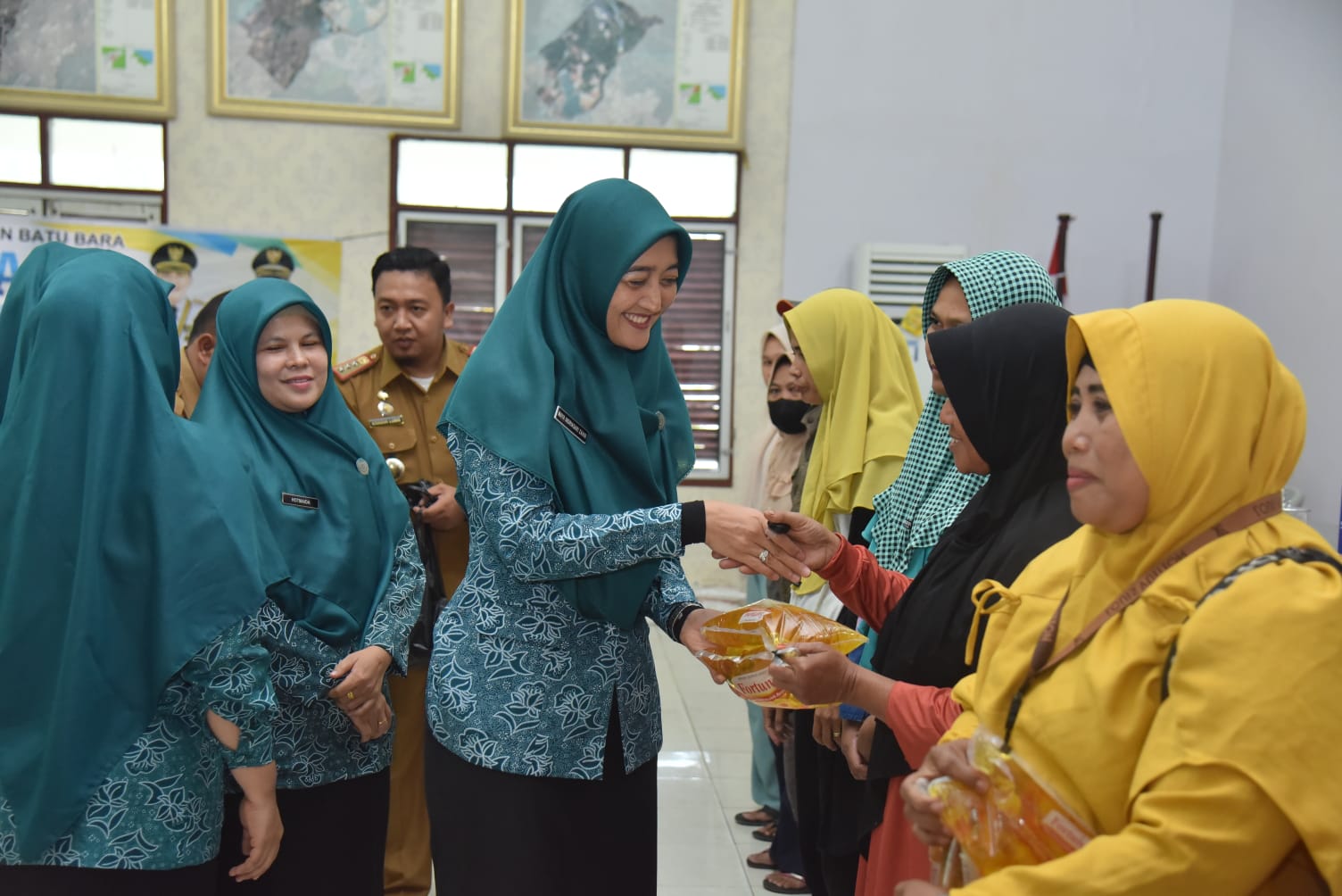 Ketua Tim Penggerak Pemberdayaan Kesejahteraan Keluarga (TP. PKK) Kabupaten Batu Bara Ny. Maya Zahir berkunjung ke Pasar Murah di Kantor Camat Air Putih.