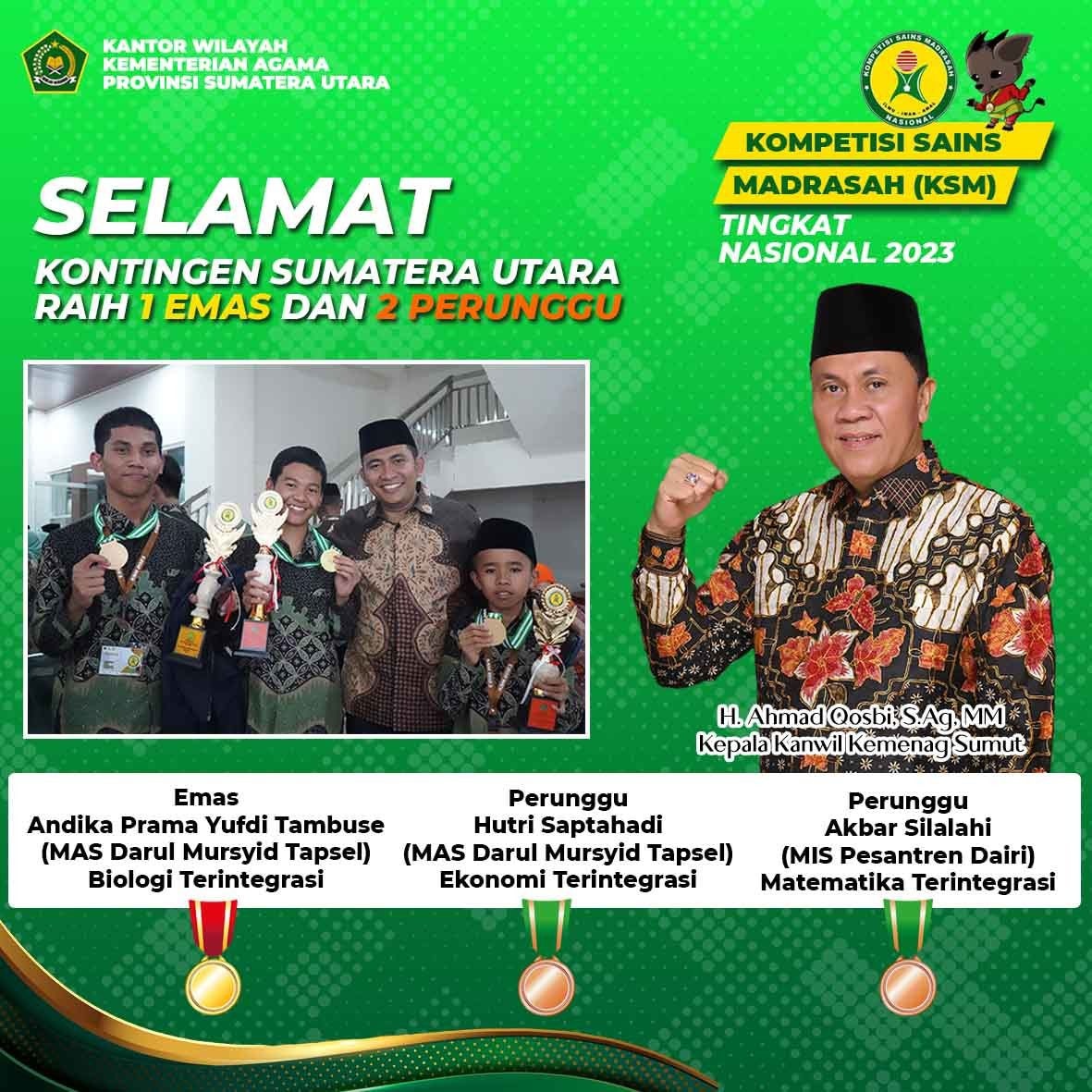 Kepala Kantor Wilayah Kemenag Provinsi Sumut Ahmad Qosbi SAg MM menyampaikan apresiasi dan selamat kepada kontingen Sumut telah berhasil meraih satu medali Emas dan dua Perunggu di ajang KSM Tingkat Nasional 2023.