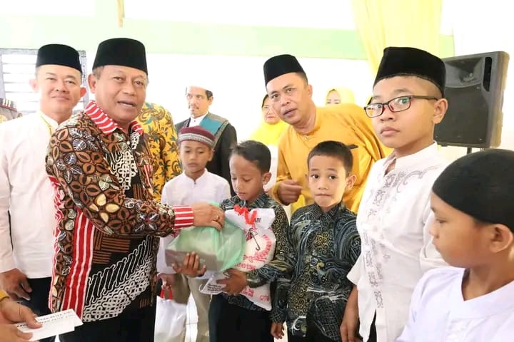 Wali Kota Tanjungbalai H Waris Tholib menyerahkan santunan 350 Anak Yatim Group Ber kah Pesta Aini di Gedung Dharma Wanita Kota Tanjungbalai , Minggu siang (12/3/2023).