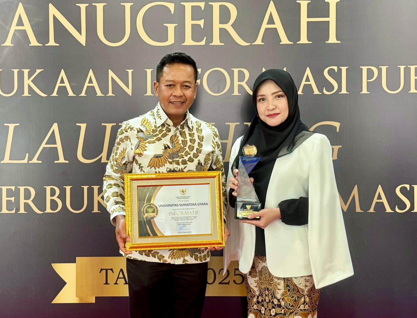Rektor USU Prof.Muryanto Amin bersama Kepala Humas USU Amalia Meutia,M.Psi,Psokolog saat menerima penghargaan Anugerah KIP 2025.(Foto : Humasusu)
