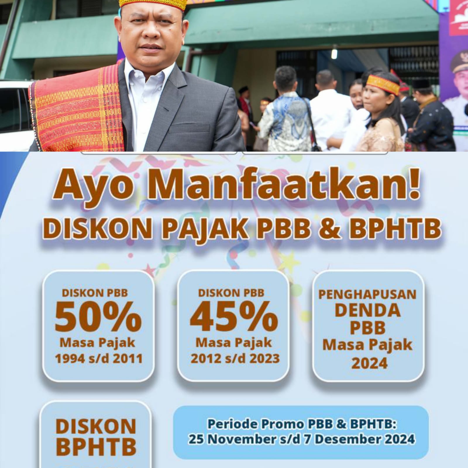Badan Pendapatan Daerah (Bapenda) Kota Medan memberi diskon Pajak PBB dan BPHTB berupa keringanan kepada masyarakat Pengurangan Pokok Pajak dan Penghapusan Denda Pajak Bumi dan Bangunan (PBB) serta Pengurangan Pajak Bea Perolehan Hak atas Tanah dan Bangunan (BPHTB). Dimulai tanggal 25 November 2024 sampai 7 Desember 2024.