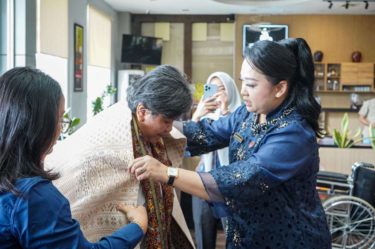 Pada kesempatan itu Airin menyelempangkan songket Melayu kepada Lestari Moerdijat sebagai bentuk penghormatan sekaligus penguatan identitas lokal.