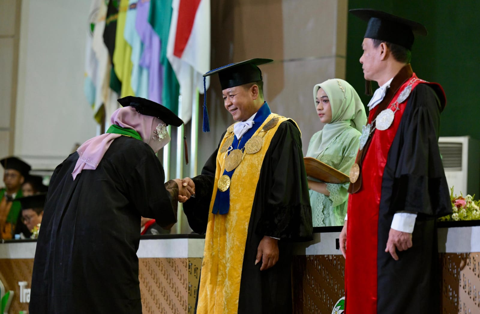 Rektor USU Prof.Miryanto Amin memberi ucapan selamat kepada wisudawan yang dilantik.(Foto : Humasusu)