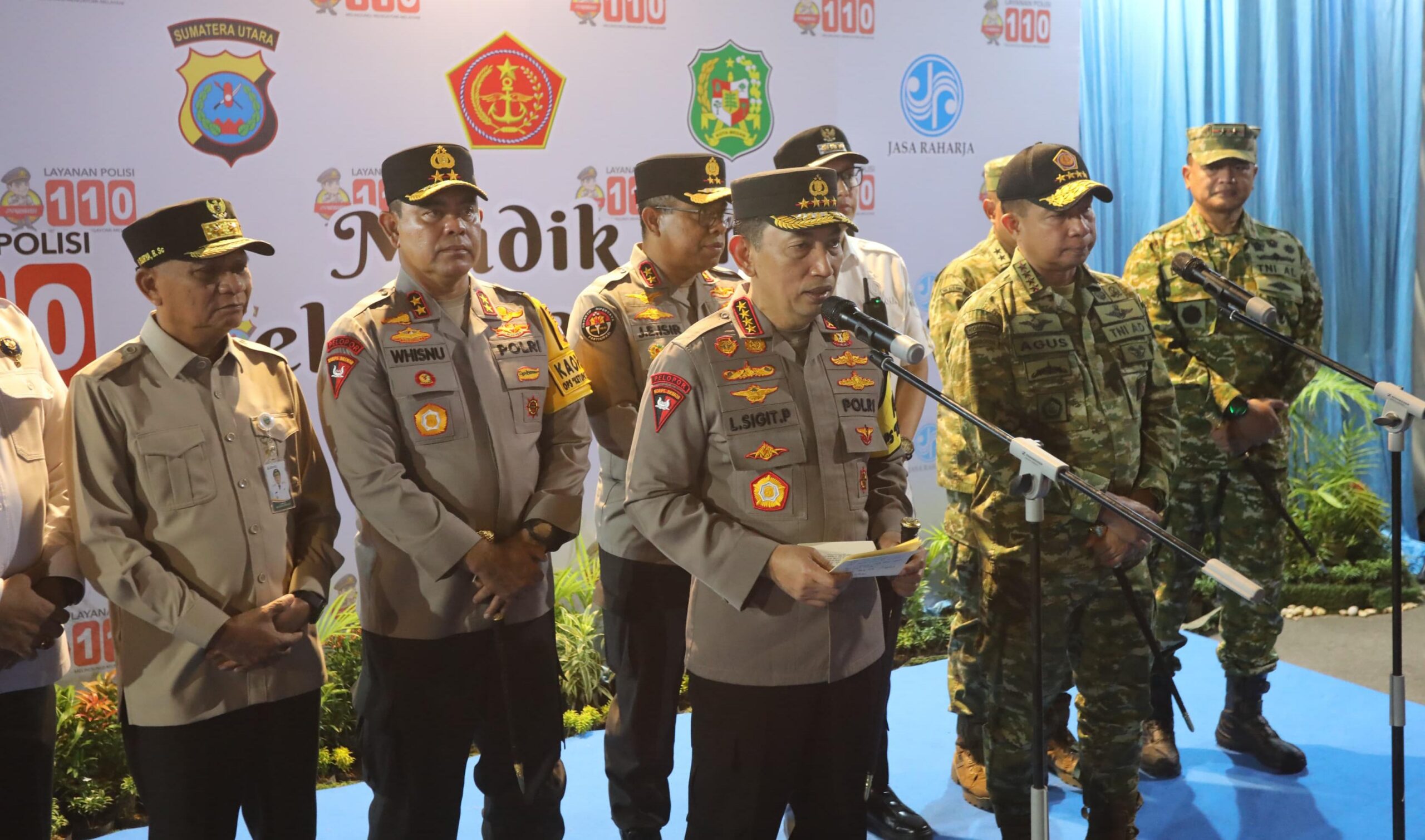 Kapolri Jenderal Pol.Listyo Sigit Prabowo didampingi Panglima TNI Jenderal TNI Agus Subianto,Kapolda Sumut Irjen Pol.Wishnu Februanto,Wagub Sumut Surya memberi keterangan pers tentang situasi arus mudik Idul Fitri 1447 H/2026 di Pos Pengamanan Terpadu Lapangan Merdeka Medan.(Foto : Istimewa)