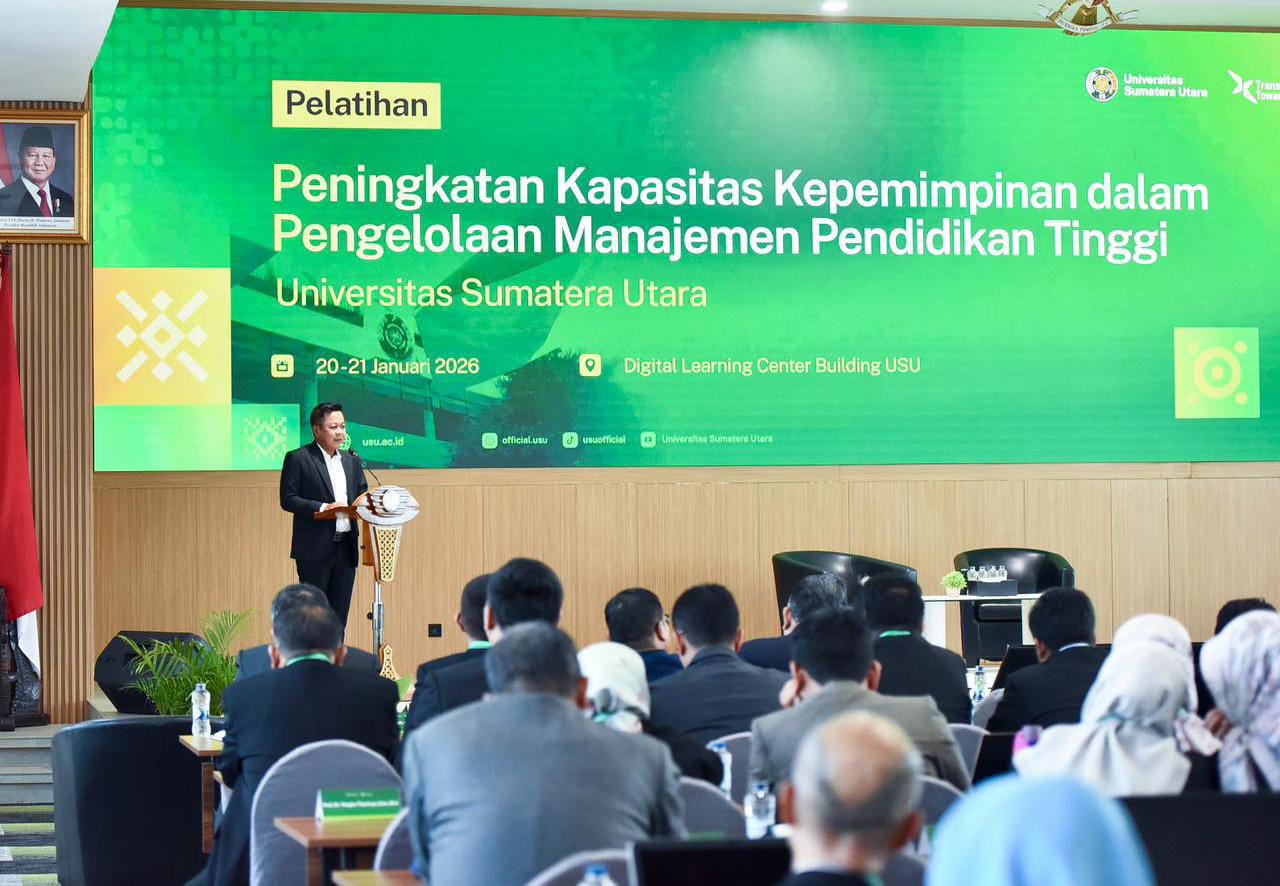 Universitas Sumatera Utara menggelar Pelatihan Peningkatan Kapasitas Kepemimpinan dalam Pengelolaan Manajemen Pendidikan Tinggi di Digital Learning Center Building USU,Senin (20/1/2026).