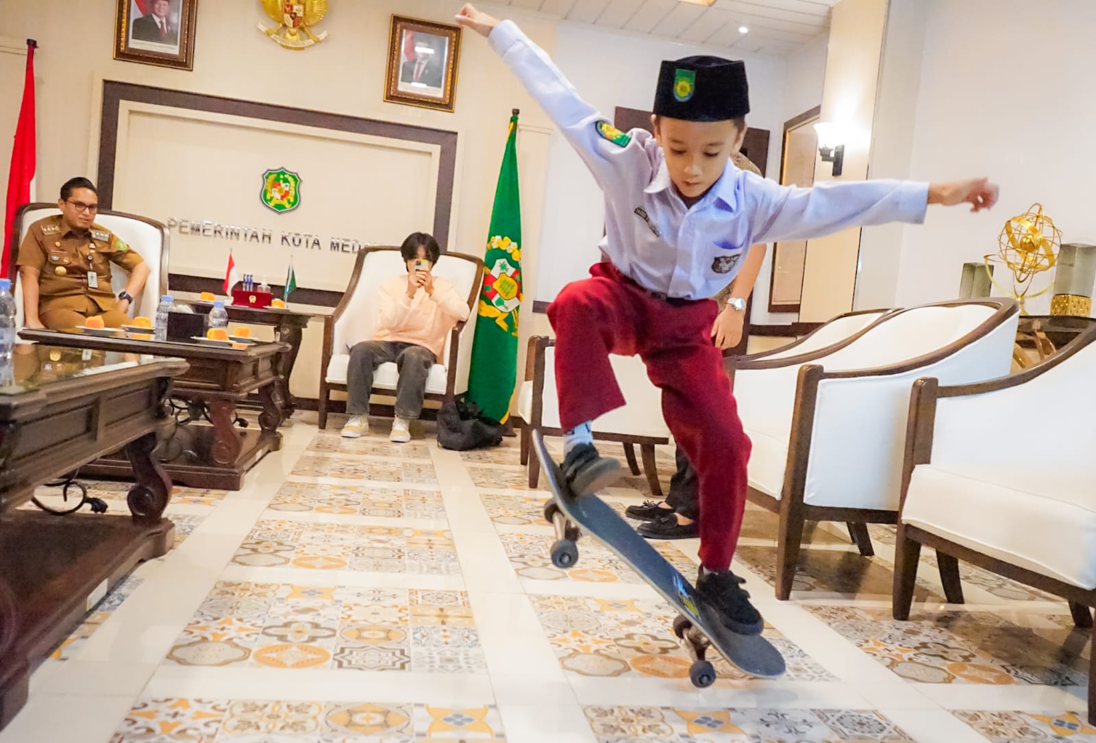 Pujian disampaikan Rico saat menerima Yazeed Abna Simatupang bersama Rizky Rinaldi coach skateboard di Balai Kota Medan, Senin (22/9/2025).